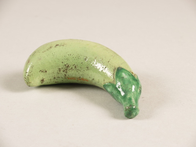 Beeld, groen geglazuurd, in vorm van vrucht, vermoedelijk augurk (Nederlands)