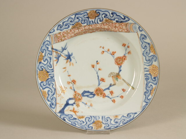 Bord met decor van uitgerolde rol waarin vogel op prunustak, imari (Nederlands)