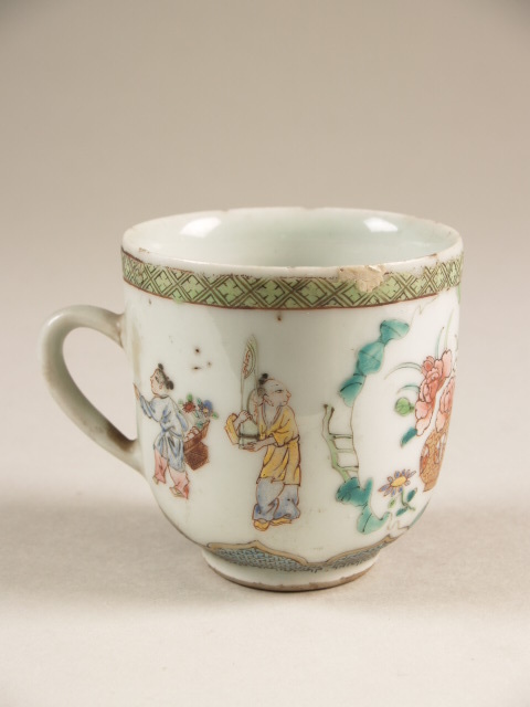Kop met oor en decor van bloemenmanden en figuren, famille rose (Nederlands)