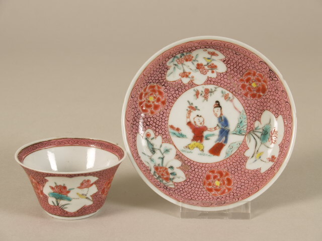 Kop en schotel met decor van lijs, zotje en medaillons, famille rose (Nederlands)