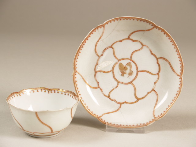 Kop en schotel met decor van slingerende vakken en een vlinder, melk en bloed (Nederlands)