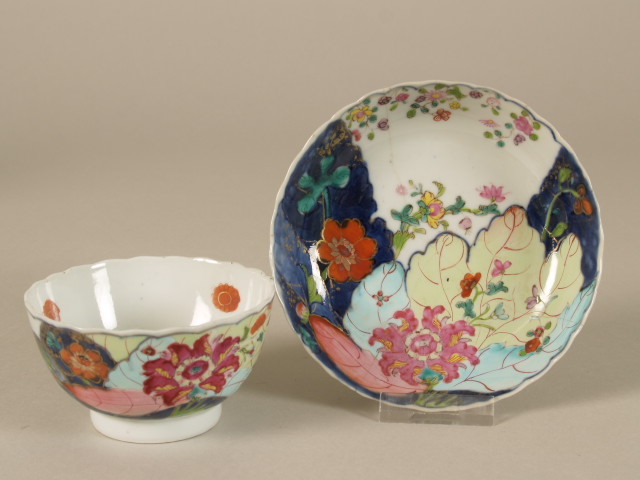 Kop en schotel met decor van bloemen, tabaksplant en rozetten, famille rose (Nederlands)