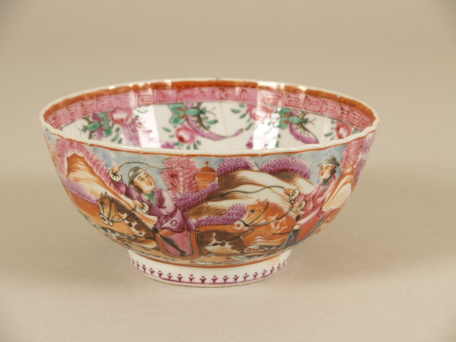 | Nederlands | Kom met decor van Europees landschap met ruiters en honden in jachtscène |