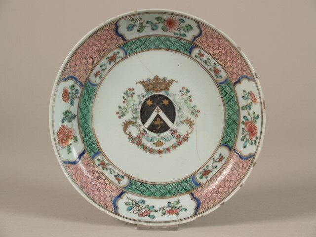 Bord gedecoreerd met het wapen van de familie Fiers, chine de commande, famille rose
