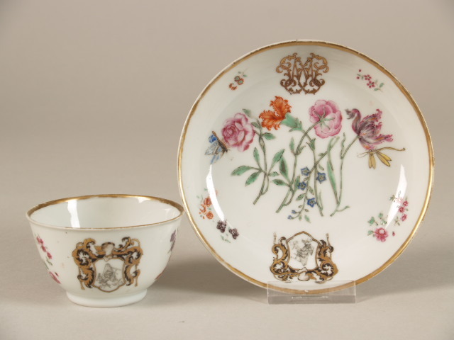 Kop en schotel gedecoreerd met een monogram (ACE), een vermoedelijk Nederlands wapen en een naturalistisch bloemdecor, chine de commande, famille rose (Nederlands)
