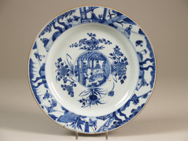Bord met verhoogd centrum en decor van figuren in een tuinlandschap en interieur (Nederlands)