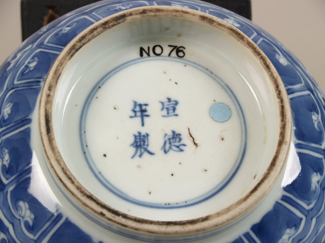 Onder op de bodem in kobaltblauw een Xuande viermerk in dubbele cirkel. (Nederlands)