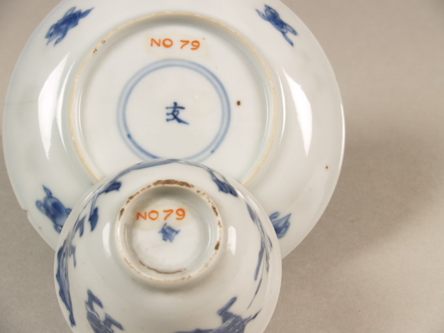 Op de bodem van de kop in kobaltblauw een gelukwens Shun binnen een dubbele cirkel. Op bodem van de schotel een merk binnen een dubbele cirkel (zie kaart). (Nederlands)
