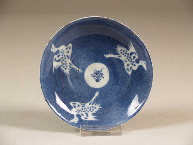 Schoteltje zonder kopje met decor van 3 kraanvogels in knipkunst sjabloon dan wel paper-cut (Q24020)