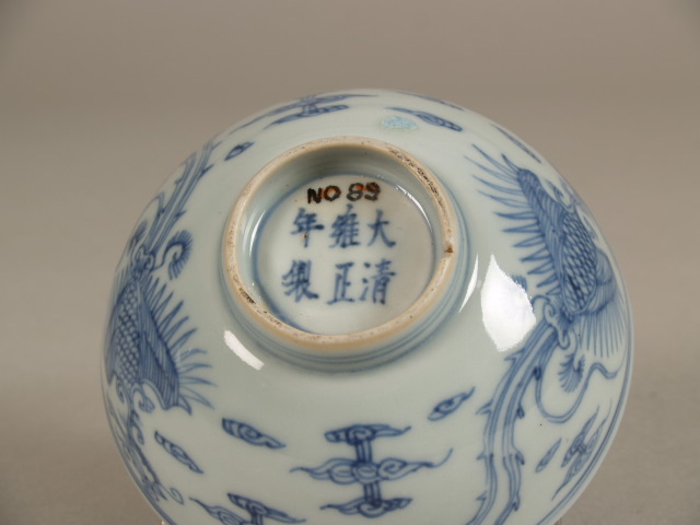 Op de bodem in kobaltblauw een horizontaal Yongzheng zesmerk in een dubbele cirkel. (Nederlands)