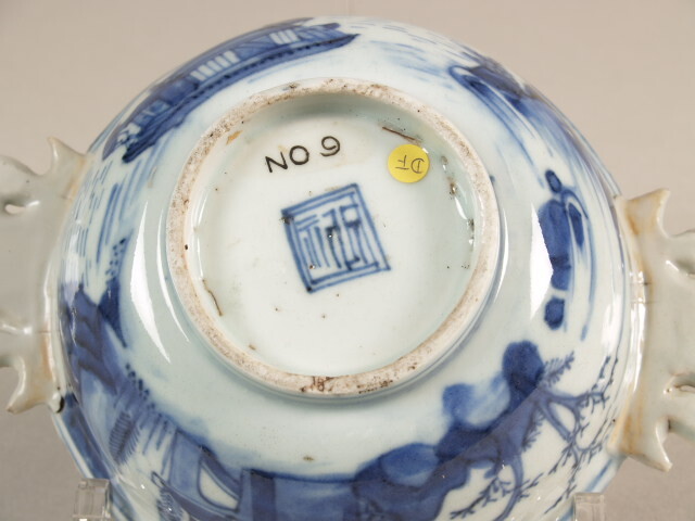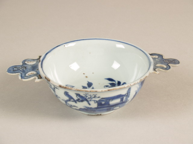 Papkom met onder de liprand ingezet twee liggende oren gevormd naar Europees zilvermodel, elk bestaand uit een middenstam die uitloopt in een middenlob met twee armen die beide tot op de basis buigen en dan weer even opkrullen. Aan de buitenzijde op de wand een voorstelling van een landschap met een door twee lieden bemande boot op een meer, rotsen met een huis en twee vogels in een boom. Aan de binnenzijde centraal een decoratie van een bloeiende plant. De bovenzijde van de oren hebben een blauwe decoratie met een wite zoom en een uitgespaard bloemetje. De decoratie is uitgevoerd in onderglazuur blauw. (Nederlands)