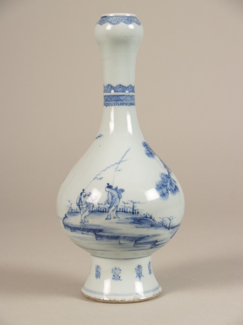 | Nederlands | Flesvaas met voorstelling van landschap met vissers, boot en karakter Shou |