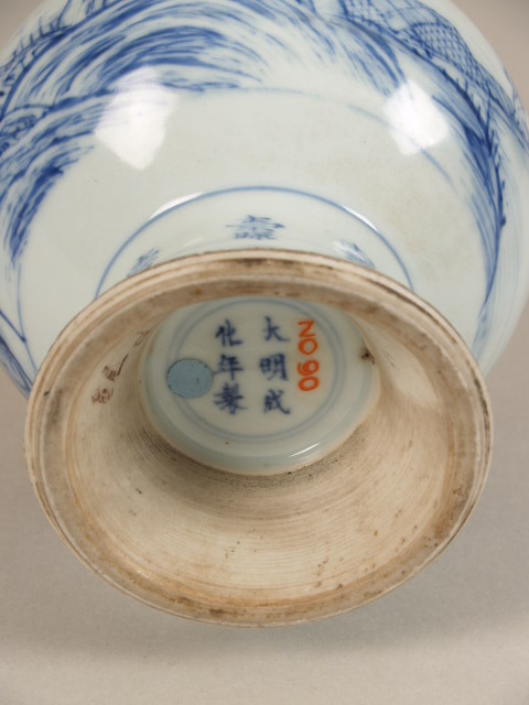 Op de bodem in kobaltblauw een vertikaal Chenghua zesmerk in een dubbele cirkel. (Nederlands)