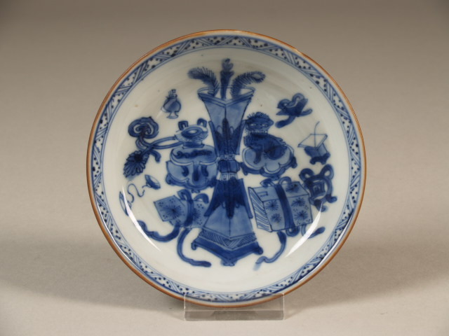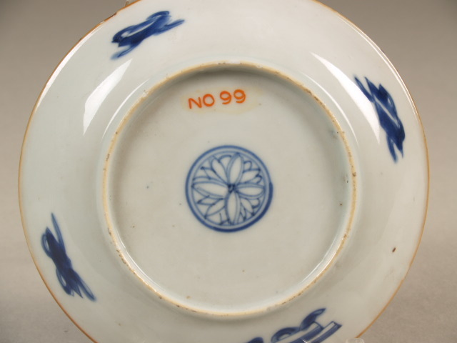 Op de bodem in kobaltblauw een rozet in een aansluitende dubbele cirkel. (Nederlands)