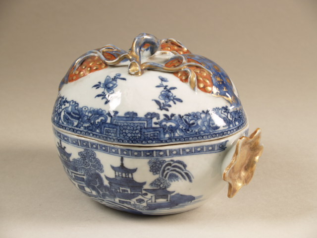 Doos met deksel in de vorm van granaatappel beschilderd in onderglazuurblauw en over het glazuur met rood en goud. Op de onderkant is een waterlandschap met figuren, bergen, paviljoen en planten. Daarboven een band van vierkanten met stipjes. Op het deksel is een decoratie in reliëf van takken met blaadjes en granaatappels. Verder een decoratie van bloemtakjes op het oppervlak en langs de rand een band met granaatappels, vlinders, bloemen en andere symbolen over het oppervlak bloemtakjes. (Nederlands)