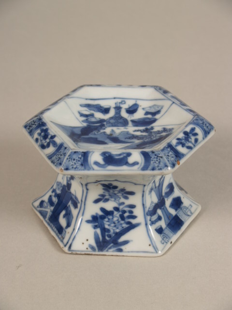 Decor in kobaltblauw. Plat: 2 waaiervormige vakken, de bovenste met enkele van de 100 oudheden, de onderste met een meerlandschap. Op de rand 6 maal een gedrukt medaillon met afwisselend een bloeiend takje en een symbool met linten, op een grond van stippeltjes en pluizige bloempjes. Op elk van de wanden van de voetring een van boven accoladegewijs geschulpt vak met afwisselend een bloeiende plant en een groep symbolen. (Nederlands)