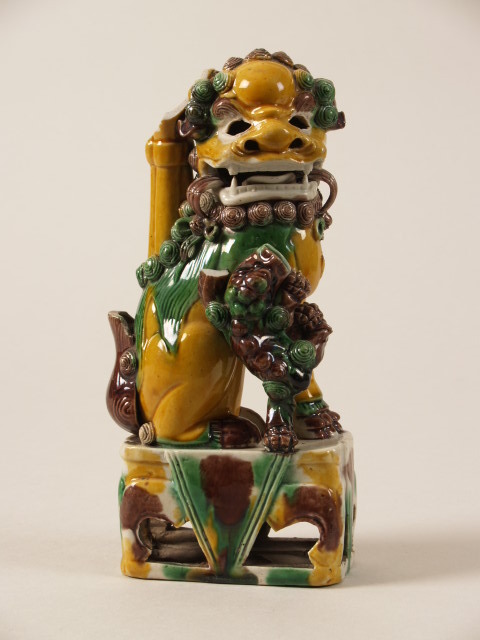 Wierookbrander in de vorm van een boeddhistische leeuw op een voetstuk beschilderd in groen, geel, zwart en aubergine. T...en jonge leeuw. Uit de rug van de leeuw komt een holle stam. Email sur biscuit||China||Keramiekmuseum Princessehof NO 00605