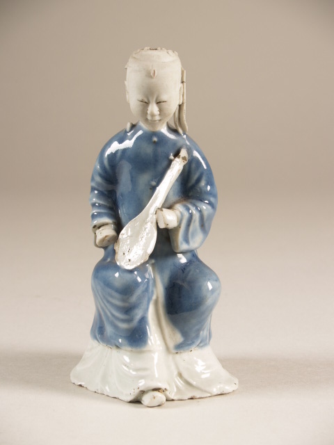 Beeld in de vorm van een vrouw, zittend met snaarinstrument en gekleed in een blauwe mantel (Q24059)
