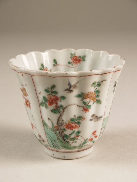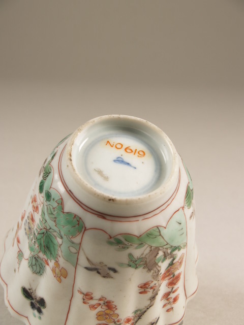 Kop met golvende en geschulpte wand met decor van vakken waarin bloemen en vogels (Q24066)