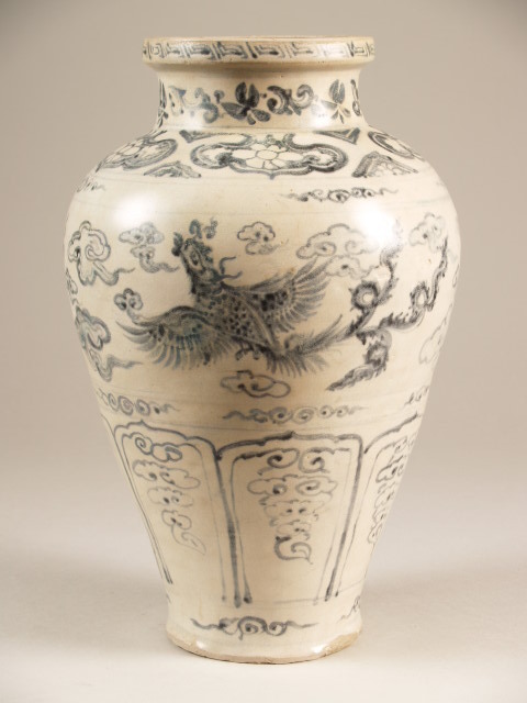 Vaas op voetring die naar boven toe wijd uitloopt. Vanaf de schouders vernauwt de nek zich naar de hals. De vaas is gedecoreerd onderglazuur grijsblauw. Op onderkant bevinden zich opstaande vlakken met daarin krulpatronen. Op de buik een decoratie van feniksen omgeven door wolken. Op de schouders en hals zijn bloemen aangebracht en rond de mond een meander patroon. De vaas is qua vorm en decroatie geïnspireerd op Chinese Ming versies uit dezelfde period, maar de losse wijze van decoratie is typisch Vietnamees. In de late vijftiende eeuw en de vroege zestiende eeuw maakte Vietnamese keramiek een bloeiperiode door, omdat de Chinese regering de export van Chinese keramiek had verboden. Veel Chinese pottenbakkers trokken toen naar Vietnam, op zoek naar werk. Daar deelden ze hun vaardigheden met hun collega’s. De Vietnamezen sprongen snel in het gat dat in de markt was ontstaan. Ze verhandelden de Vietnamese keramiek met buurlanden Thailand en Birma, maar ook met verder gelegen landen zoals de Filippijnen en Indonesië. Vietnam beleefde zijn eigen Gouden Eeuw. (Nederlands)