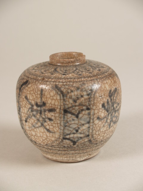 Pot met decor van panelen waarin karakters omgeven door randen met golfmotieven (Nederlands)