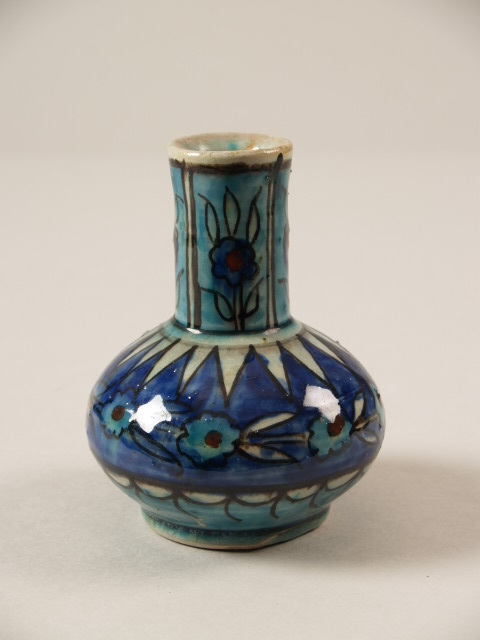 Bolle buik, gedrongen vorm met rechte hals. Beschildering in de vorm van bloemetjes + puntvormen in blauw, beige en rood.||Kütahya||Keramiekmuseum Princessehof GMP 1996-030 |