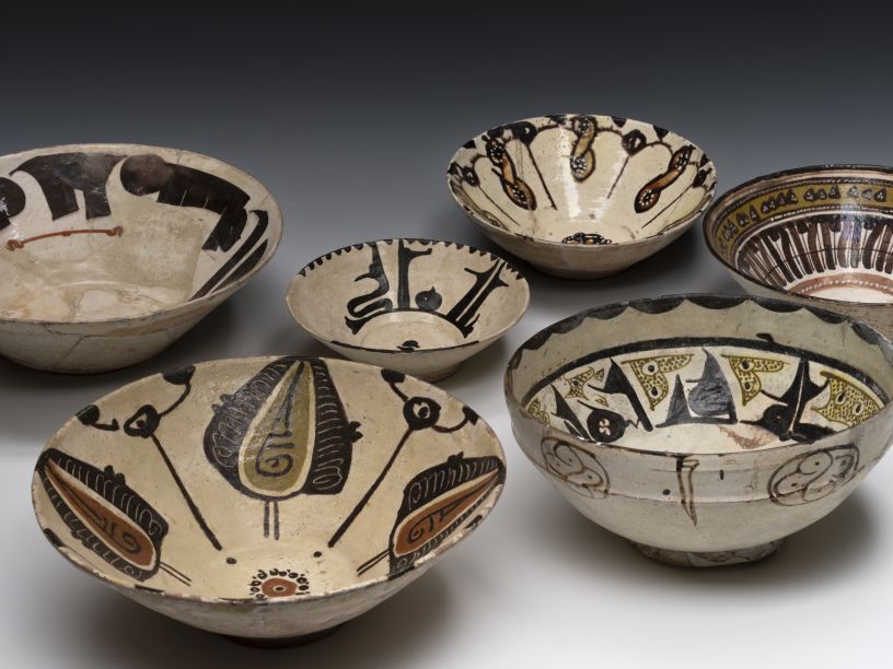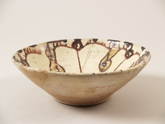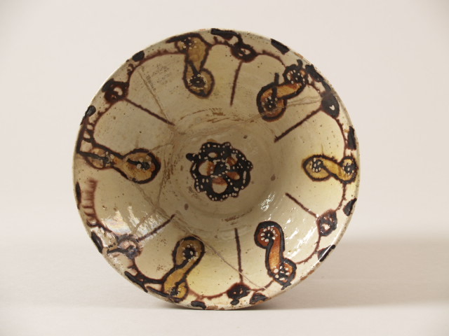 De binnenzijde van de kom is bedekt met een witte engobe en vervolgens beschilderd met abstracte ornamenten in geel, aubergine en bruin (Nederlands)
