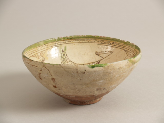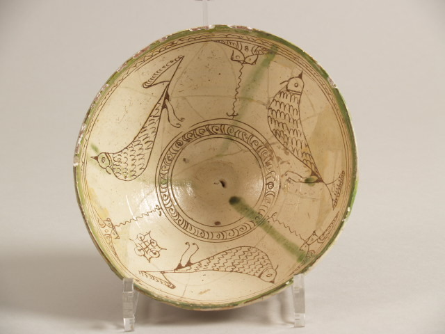 de kom is bedekt met engobes en voorzien van een decoratie in de vorm van drie vogels. Deze zijn aangebracht in de sgrafitto techniek. De buitenkant van de kom is deels bedekt met engobe. (Nederlands)