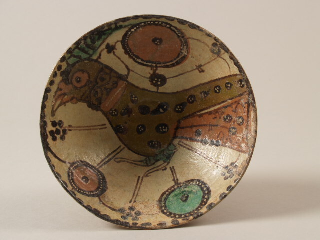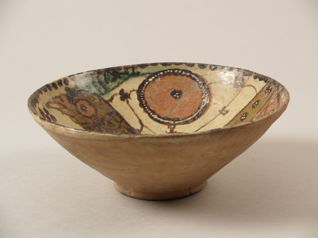 De kom is voorzien van een meerkleurige decoratie in de vorm van een vogel over het gehele vlak. Voorts drie 'ballen' omgeven door parelranden. De gebruikte kleuren zijn groen, rood, bruin, aubergine en creme.; De buitenkant van de kom is niet versierd. (Nederlands)