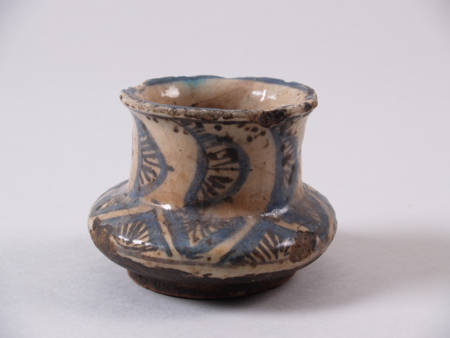 Afgeplatte bolle vom met een brede recht opgaande hals met overkragende liprand. Op een cremekleurig fond is een beschil...n motieven verwant aan de zeilen van een schip. De onderzijde ongeglazuurd.||Iran||Keramiekmuseum Princessehof GMP 1996-091