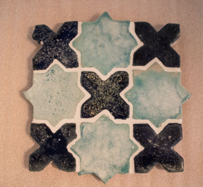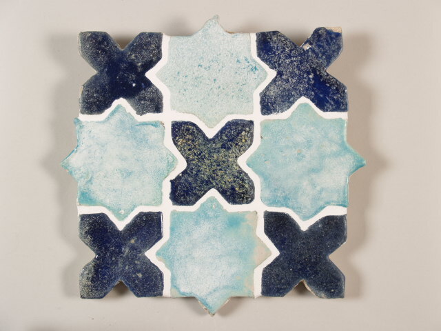 Tegelveld bestaande uit vier turquoise stertegels en vijf donkerblauwe kruistegels. Aan de achterzijde is een ijzeren haakje aangebracht.||Takt-i Süleynan||Keramiekmuseum Princessehof GMP 1996-104 |