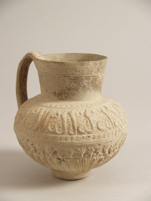 Kan met handvat en vrij afgeplatte, brede buik. Op het voorwerp zijn in relief versieringen aangebracht in de vorm van streepjes en Kufisch schrift||Nishapur||Keramiekmuseum Princessehof GMP 1996-106 |