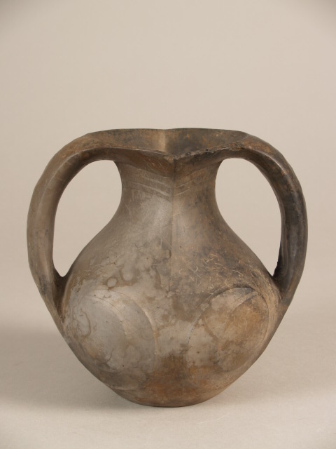 Donkergrijs, gepolijst steengoed, naar bronzen voorbeeld, met twee vanuit de nek komende platte oren die op de schouder ... de oren twee ronde uithollingen en een dubbele ingekraste rand in V-vorm.||China||Keramiekmuseum Princessehof OKS 1997-020