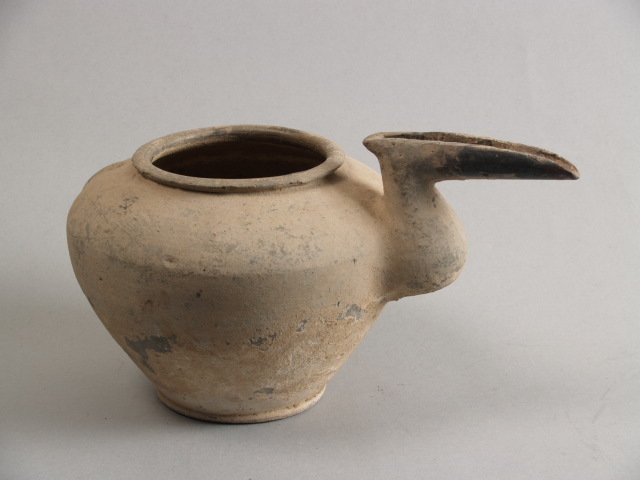 De kan is vervaardigd van zwart bakkende klei en niet voorzien van een beschildering. Tegenover de horizontaal gerichte 'snavel' bevindt zich een verticaal aangebrachte kleine 'nok'. (Nederlands)