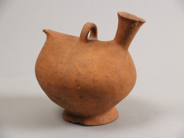 De rhyton is vervaardigd van roodbakkend aardewerk en spaarzaam versierd met ingekraste zig zag lijntjes. Op de tuit zijn twee kleine nokjes aangebracht die ogen suggereren. Op de bovenkant is een halfrond oor aangezet. De onderkant is voorzien van een standring.; (Nederlands)