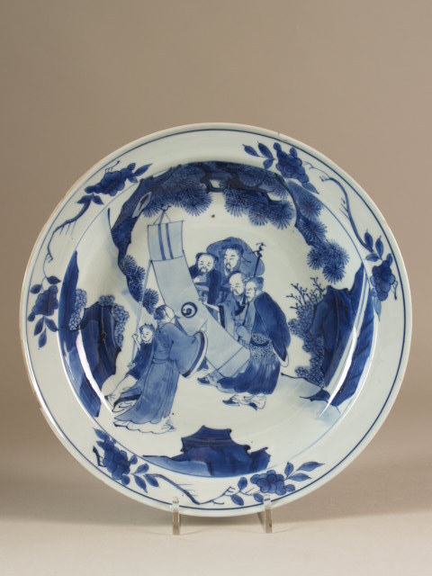 Schotel waarop afgebeeld een aantal wijsgeren rond een schildering, debaterend over yinyang (Nederlands)