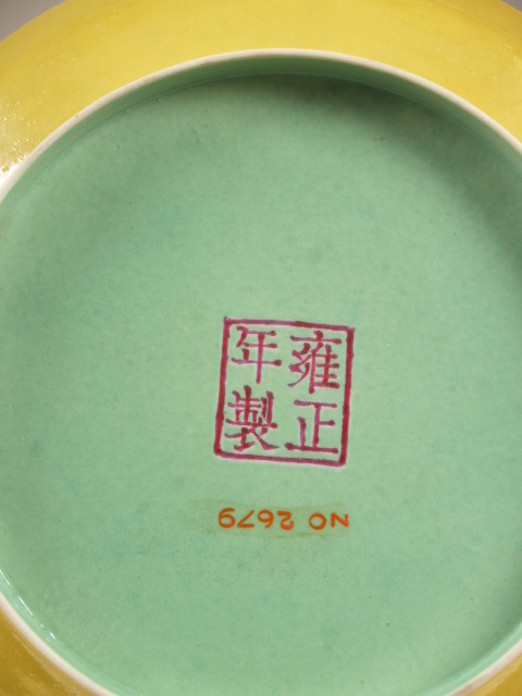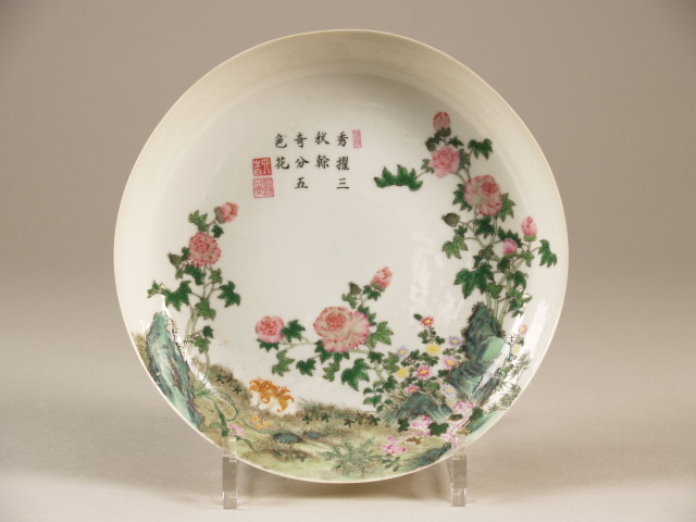 Borde met aan de binnenkant over het gehele vlak een landschapsdecoratie in famille rose van bloemen en rotsen. Links in het midden bevind zich een gedicht: Weelderig groeiende drie herfststronken, prachtig verdeeld de bloemen in alle kleuren (vertaling zie inventariskaart, 秀擢三秋幹,奇分五色花) De achterkant van het bord is uitgevoerd in monochroom geel op de rand en turkoois binnen de voetring met daarin een vier-karakter merk van de keizer Yongzheng. (Nederlands)
