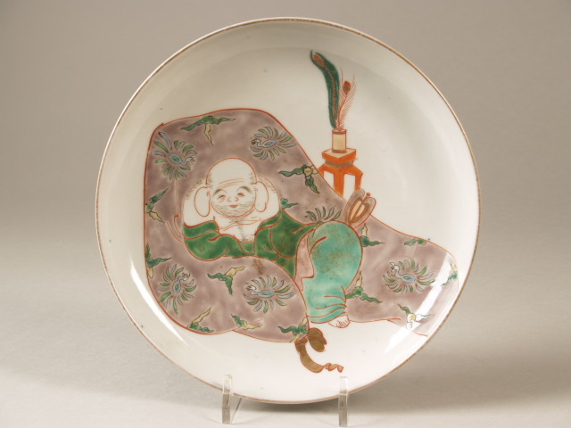 Bord met decor van Hotei (Budai) zittend op kussens (Nederlands)