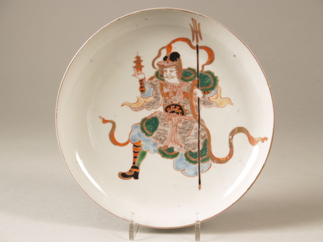 Bord beschilderd op het glazuur in blauw, rood, groen, bruin, goud en zwart. Over het gehele oppervlak een decor van Bishamonten (毘沙門天,Tamonten); één van de vier beschermers (Shitennō), hij is de bewaker van het Noorden. Bishamonten is gekleed in een militaire uitrusting, draagt een hoofddeksel en heeft een kleine pagode in zijn rechterhand, en inn zijn linkerhand houdt hij een speer. Het rechterbeen ontbreekt. Vergulde rand. Bishamonten wordt in Japan gezien als de god van oorlog en strijders, en de wreker van kwaaddoeners. Ook wordt hij gezien als de beschermer van de plaatsen waar Boeddha's leer wordt doorgegeven. De pagode die hij in zijn linkerhand houdt, symboliseert de plek die hij beschermt. (Nederlands)