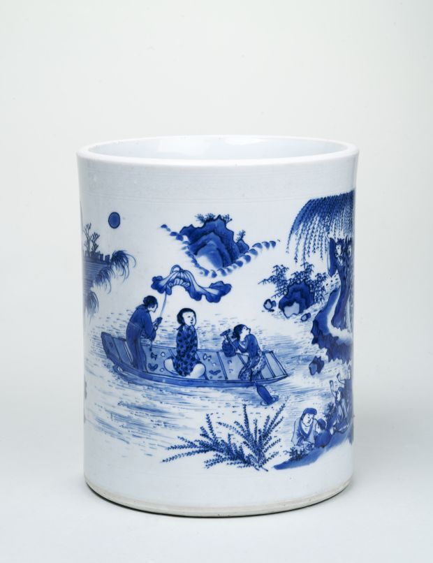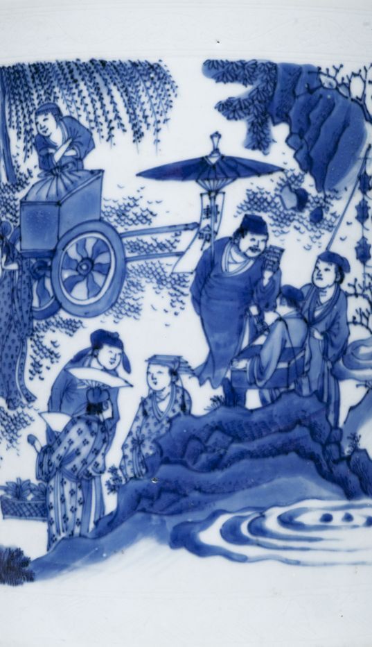 Penselenpot met decor van figuren in een tuinlandschap met rivier (Nederlands)