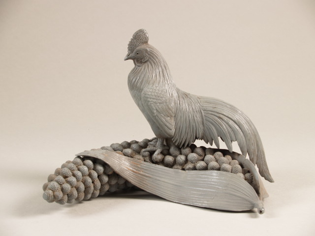 Beeld van fijn gedetailleerde haan op vruchtkolf, monochroom lichtgrijs (Q24219)