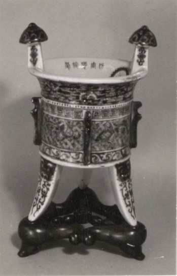 Wierookbrander op 3 poten en met oor met decor van meanders en vleermuizen op een voetstuk (Nederlands)