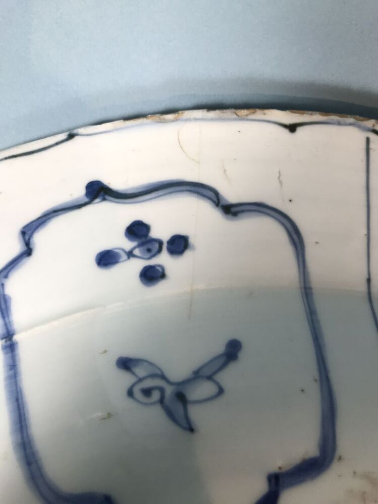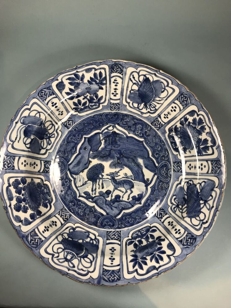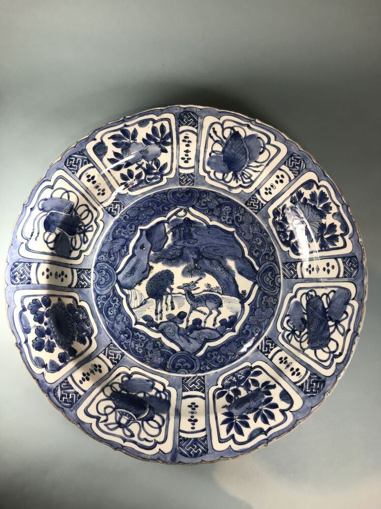 Schotel, lampetschotel, met decor van achtkantig paneel waarin herten in een landschap omgeven door vakken met symbolen of bloemranken (Q24250)