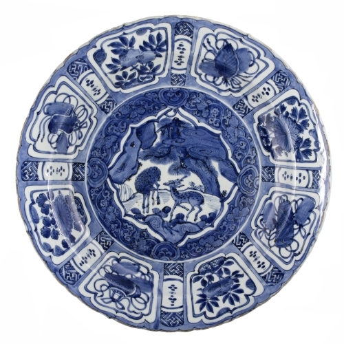 Schotel, lampetschotel, met decor van achtkantig paneel waarin herten in een landschap omgeven door vakken met symbolen of bloemranken