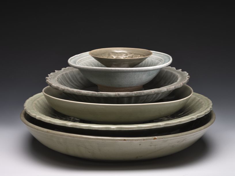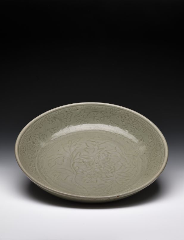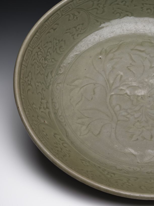 Schaal met decor van ingegrifte bloem, celadon (Q24256)