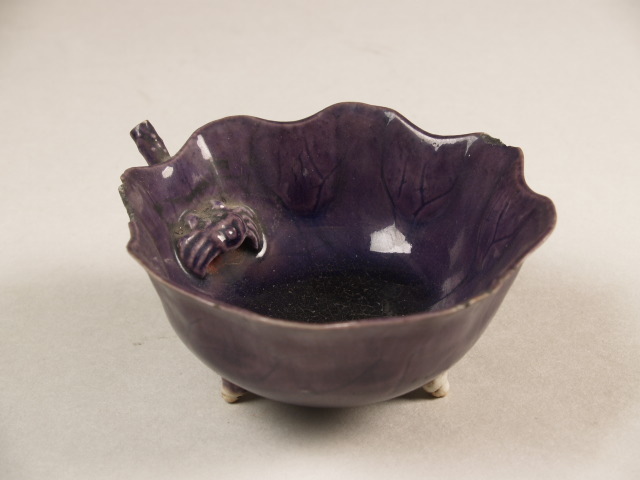 Waterdruppelaar op drie pootjes in de vorm van een lotusblad bedekt met een paarse monochrome glazuur. Zowel aan binnen ...onder ziten een gaatjes waar het water via de steel uit gedruppelt kan worden.||China||Keramiekmuseum Princessehof NO 03944 |