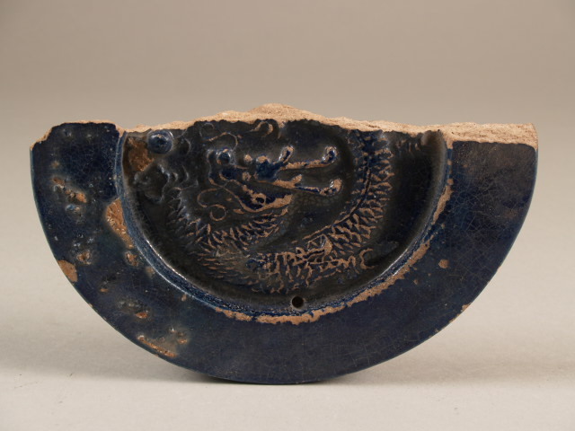 | Nederlands | Scherf van nokdakpan met reliëf van draak en bedekt met diep paars-blauw glazuur |