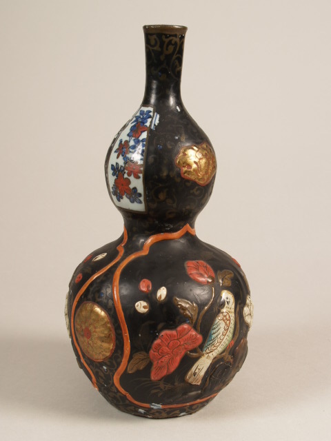 Knobbelfles met decor van cartouches waarin een vogel met bloemen, deels in onderglazuur blauw en deels in lak (Nederlands)