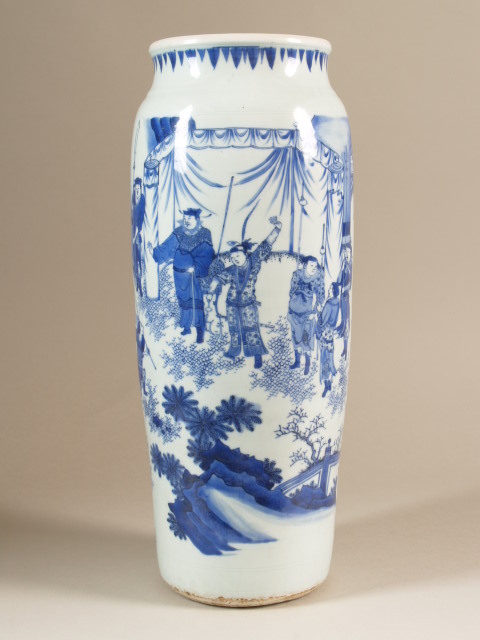 Legerscène. Volgens Wen-Chin Hsü die dit object in 1979 beoordeelde is het decor een voorbeeld van het verhaal van de "Water Margin" (zie NO 00902). Ten tijde van de opstand vluchtten mensen de bergen in om hun eigen regering te vormen en de armen te helpen zich te verzetten tegen het corrupte officiële regime. Uiteindelijk echter, onderwerpen de rebellen zich, uit Confuciaans respect, aan de keizer en vechten voor hem. (Nederlands)