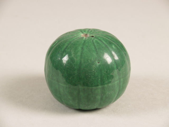 Beeld in de vorm van een ronde vrucht, met groen glazuur (Nederlands)